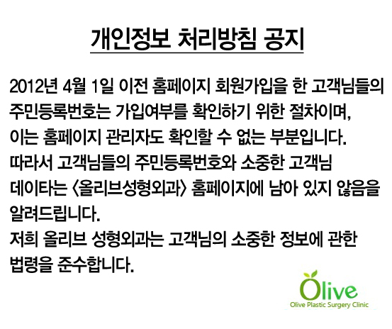 올리브성형외과는 고객님의 개인정보보호를 위해 개인정보 보호지침을 마련하여 이를 준수하고 있습니다.